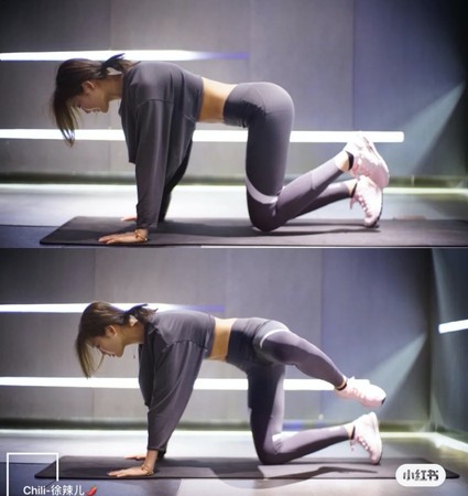 先以双手撑地,双腿跪于地面,抬起一腿弯曲往上踢,要感觉是用臀部上沿用力,腿部不要出力,15下为一组,每边共做2组。