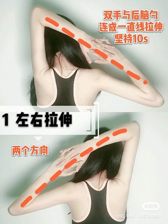 双手和后脑杓连成一直线拉伸,动作幅度可视自己的状况,幅度渐渐加大。