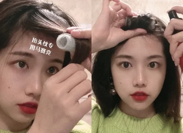 如果是有浏海的女孩,可以使用发卷制造浏海蓬松度!首先将发卷卷至贴近头皮发根,接著拿出定型喷雾,距离约2-3个拳头距离喷在浏海上,才不会让头发干硬~除了控制好距离,记得要选择自然型的定型喷雾,也能让卷度看起来更自然!如果怕定型时手残,发型师表示可以直接将定型喷雾喷在发卷上,再卷上浏海吹整,这样就不怕会失手!