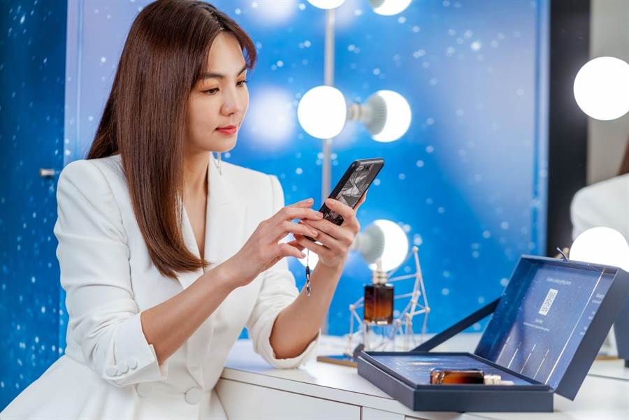 雅诗兰黛撼动全球保养新革命线上直播记者会,ELLA使用使用小棕瓶AR传奇之旅。(雅诗兰黛提供)