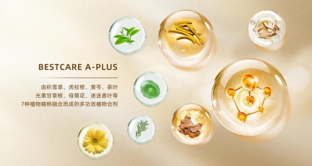 此外,由积雪草、虎杖根、黄芩、茶叶、光果甘草根、母菊花、迷迭香叶等7种植物精粹融合而成的多功效植物合剂,也具有强大的抗衰老、抗敏舒缓、亮白保湿等多重功效,可以多维度滋养和舒缓强韧肌肤。