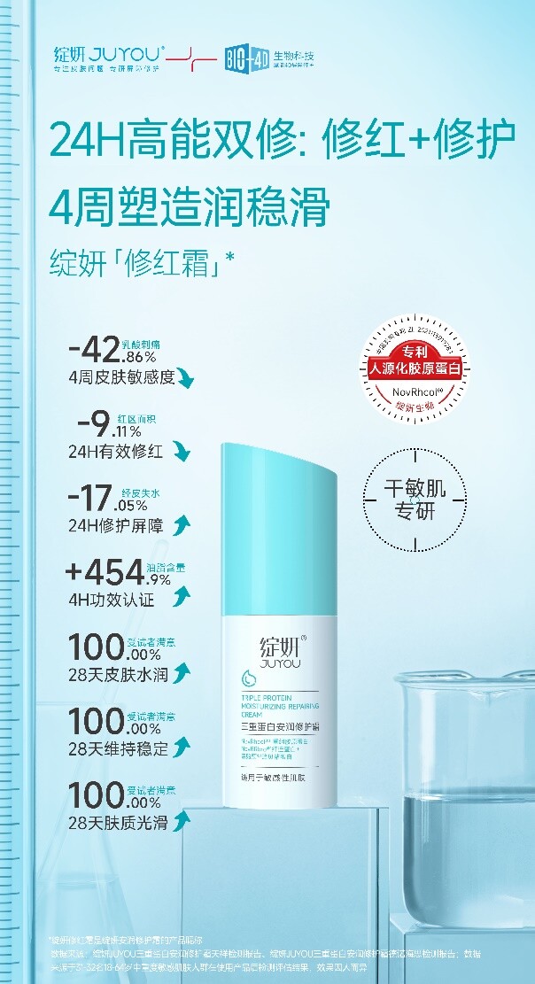 肌肤出问题,绽妍来救急!绽妍修红霜24H抢修干痒红,稳定皮肤状态。经权威机构检测,红区面积减少9.11%,经皮失水减少17.05%,救急修护表现出色。四周后皮肤敏感度下降42.86%,100%受试者认同产品功效。