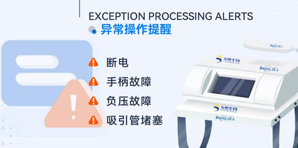 熙倍睿水光靓肤仪器具有多项异常操作提醒功能,提供包括断电、手柄故障、负压故障、吸引管堵塞在内的多种异常情况监测及异常情况警示,实时监测仪器运行状态,精准定位故障部位,及时发现问题以避免无效操作浪费产品 。