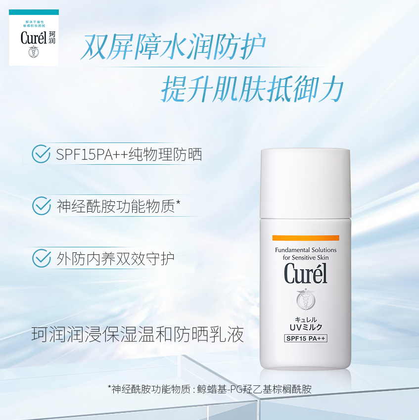 冬季的紫外线强度性比夏季时弱了很多,但并不代表着不存在哦!对于敏感肌来说,一年四季防晒工作还更是不能松懈。珂润润浸保湿温和防晒乳液,SPF15PA++纯物理防晒,抵御日晒带来的伤害。神经酰胺功能物质*配合蓝桉叶提取物等保湿成分,稳固肌肤屏护力。外防内养双效守护,减少紫外线刺激,为你撑起美白防护伞。
