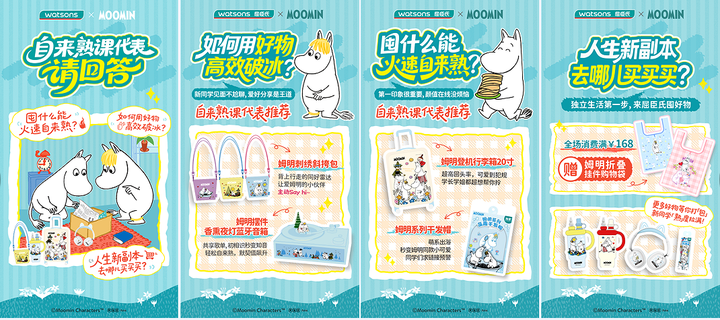 丰富选品面面俱到,让大学生安心融入新环境之外,屈臣氏还以真实感、强创意互动让大学生们玩在一起,借姆明一族的温暖治愈力量让开学变得更加鲜活、有趣。
