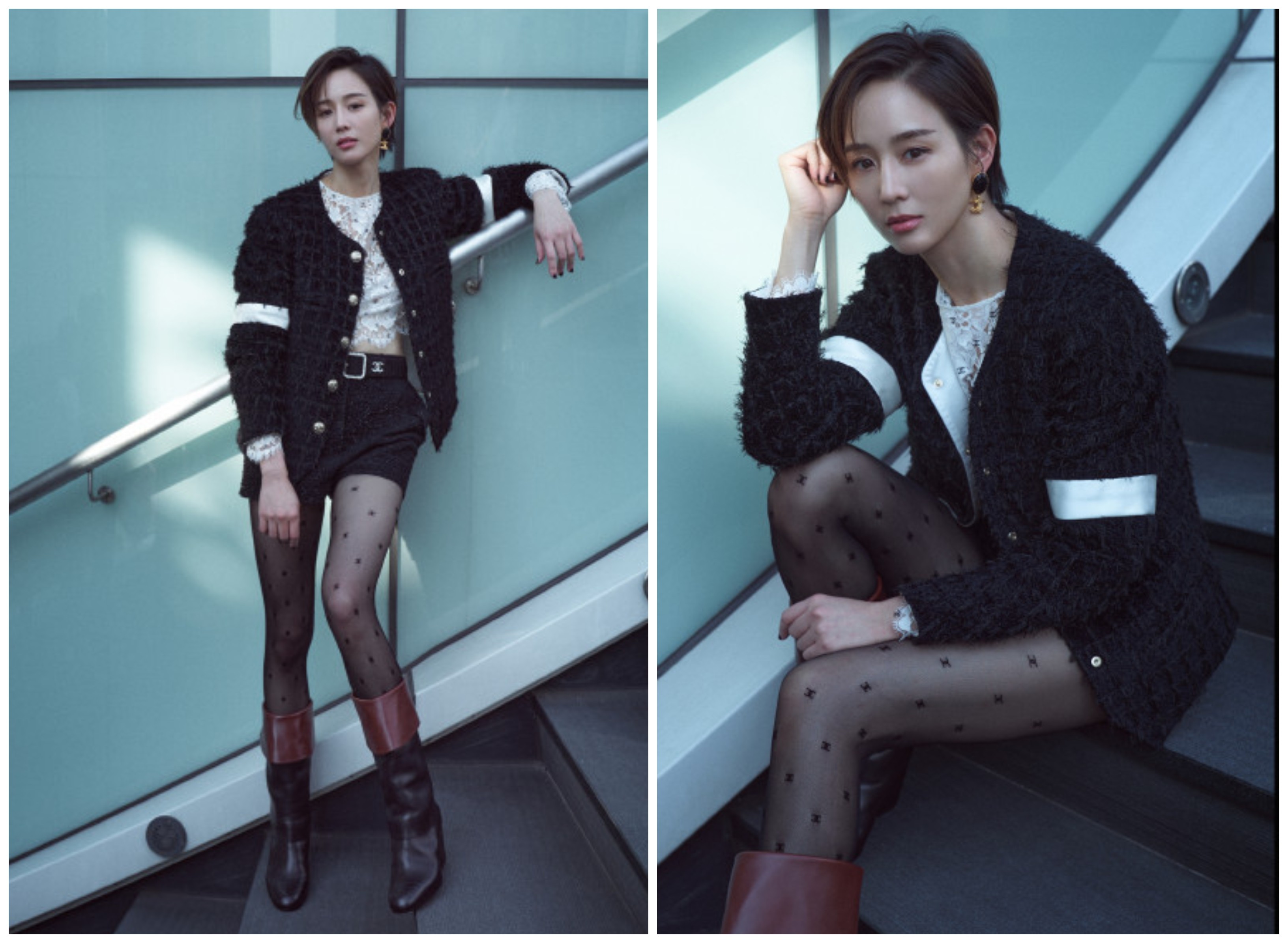 女神张钧甯一头俐落短发,搭配裤装与中长靴,内搭话题超高的CHANEL双C logo 透肤丝袜,率性又优雅,随意慵懒地靠在阶梯扶手上,展现了微性感的法式女人风格。