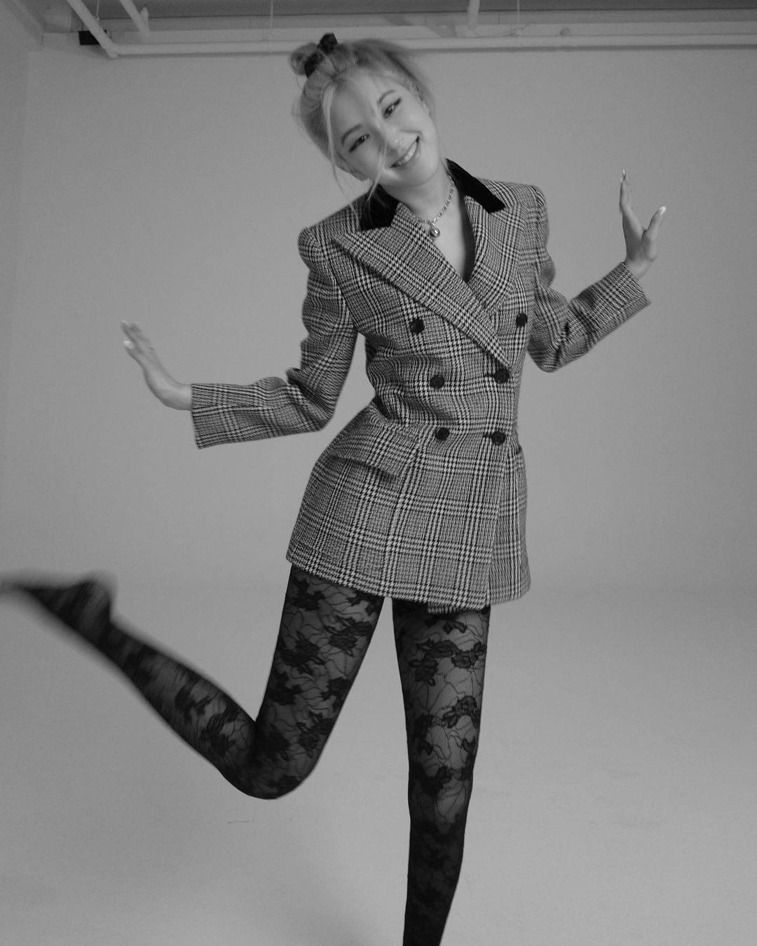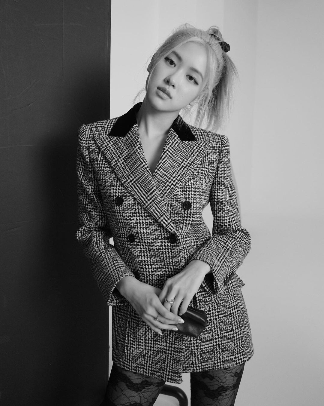 将格纹大衣扣子扣满,并抓出腰身变成小洋装的Blackpink Rose,美腿一览无遗,小心机穿上透肤的SAINT LAURENT黑色蕾丝裤袜,简单打造出层次感,半透明的材质也增加造型的变化性,直接化身微性感女神。
