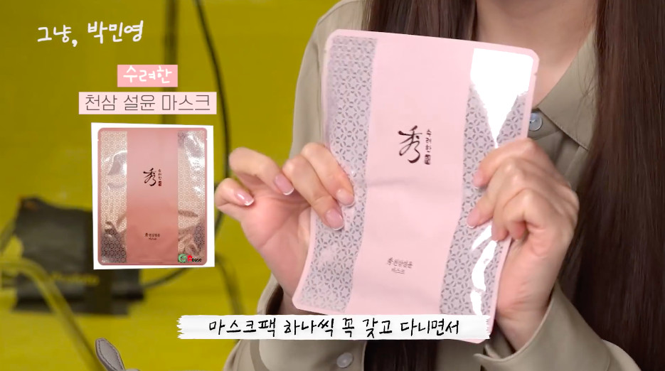 身为美妆品牌秀雅韩(Sooryehan)的代言人,朴敏英本人也相当尽责且捧场,身上一定会带著一片美白面膜、气垫粉饼以及随身瓶精华液。