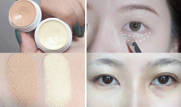 想画出可爱奶感的卧蚕眼妆,眼影打底非常关键!上眼折我们搭配眼影打底膏均匀暗沉肤色;下眼周处(到眼睑)则选用比肤色明亮的遮瑕膏,以轻轻点压的方式将黑眼圈与泪沟柔焦,如此能方便后续卧蚕可以更加显色,也避免阴影处显脏。