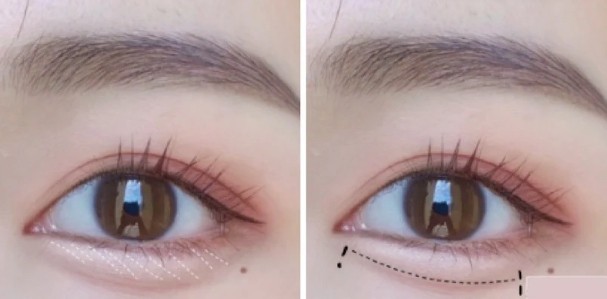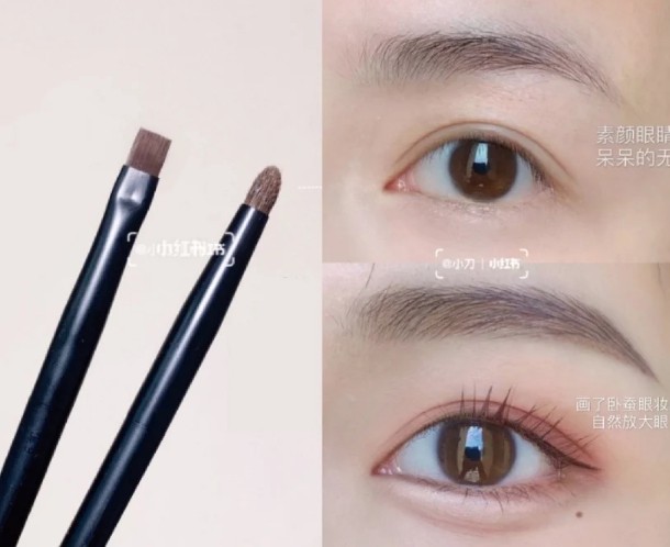 画卧蚕时,先沾取缎光香槟色眼影,勾勒下眼睑前端到卧蚕处。再用浅米棕色(或灰感的鼻影),画在比本身卧蚕再上缘一点点的位置。这样卧蚕才会更加自然、不突兀。