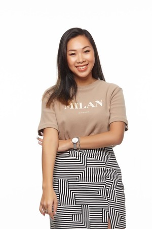 Angela 的第一个妆容,Bobbi Brown 全球专业彩妆师杨中豪(小宝老师)为 Angela 打造自然健康的小麦色妆容,搭配奶茶色 T-Shirt 与线条感强烈的短裙,整体造型充满青春、俏皮的气息。Outfit(T-Shirt by Wstyle)