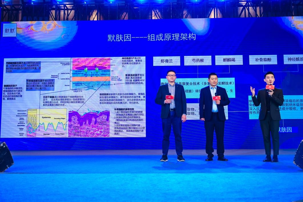 历时3年时间,经过1689种成分实验,153轮成分筛选,3000余次外体实验,默默自主研发淡纹抗老成分默肤因最终完成。默默科研工程师对默肤因成分进行现场说明。默肤因通过科学配比,利用多重植物发酵技术提纯有效成分,将6种精粹成分通过纳米乳液技术融合,协同增效,提升肌肤主动防御能力,增强修护能力,促进蛋白合成速度,深入肌底使产品原料发挥作用。实验表明,默肤因与默默麒麟竭相比,淡纹修护紧致效果更明显。