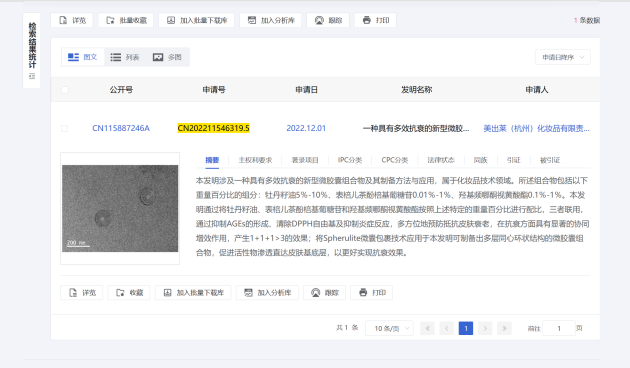 根据在国家专利平台公示的信息显示,花皙蔻“牡丹多效抗衰新型微胶囊专利”属于一种多效抗衰的新型微胶囊组合物及其制备方法应用,将牡丹籽油等成分按特定百分比配比,三者结合可通过抑制AGEs(过量的糖和蛋白质结合产物)形成,清除自由基及抑制炎症反应,多方位地预防、抵抗皮肤衰老;同时,微囊包裹技术可促进牡丹活性成分直达皮肤基底层,渗透率更快、更全面,这也意味着采用此技术的产品效果将更为显著。