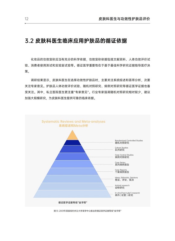 报告指出,皮肤科医生在功效性护肤品的应用中具备显著的“循证”优势。在选择功效性护肤品时,皮肤科医生群体最关注系统综述、荟萃分析、专家意见或共识,同时,与人体功效评价试验、随机对照研究、病例对照研究等相关的循证证据亦会被纳入考量范围。