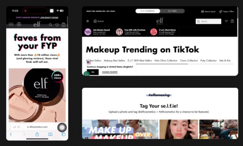 例如,美妆品牌 e.l.f 长期坚持行业创新、打造文化潮流。在 e.l.f 的品牌官网上,用户可以看到 TikTok 流行的美妆趋势 (Makeup Trending on TikTok) 和相关美妆产品。e.l.f 还发起 UGC 互动,鼓励用户在 TikTok 发布使用 e.l.f 产品后的妆容照片,共同引领美妆潮流影响力。