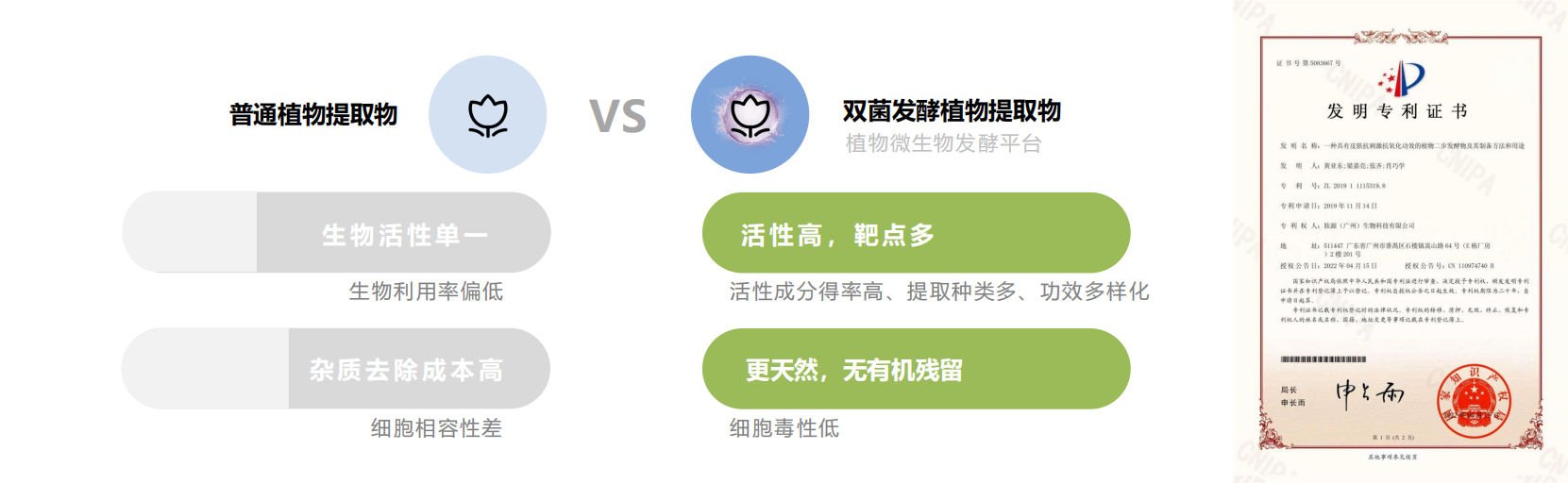 基于植物双菌发酵技术,肽源生物成功开发出Fermentract® CENA 源肤欣(积雪草)、Fermentract® ML 源肤白(桑叶)和Fermentract® HS 源肤舒(忍冬)等一系列创新原料。值得一提的是,该植物双菌发酵技术凭借其创新性和独特价值,还荣获了多个国家发明专利。