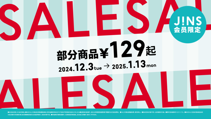 寒冷的12月来临之际,JINS睛姿的冬日大促活动也随之而来。JINS睛姿用超多性价比高的眼镜和惊喜折扣,来回馈广大消费者一直以来的喜欢和支持。从2024年12月3日开始至2025年1月13日,JINS睛姿部分人气商品¥129起。只需要超高性价就能比入手冬季时髦眼镜单品,为冬日搭配增加更多新鲜感。JINS睛姿本次冬日大促活动,以性价比高的眼镜为核心亮点,涵盖太阳镜、光学镜、功能型眼镜太阳镜等多个品类,消费者可以尽情挑选。