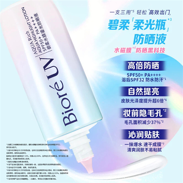 随着消费者防晒需求日趋多元,除了关注防晒指数外,提亮肤色、修饰毛孔等附加价值也备受关注。为持续满足人们不断进阶的防晒期待,花王旗下“碧柔(Bioré)”品牌于2026年2月,全新升级推出“碧柔水膜鎏光防晒液(碧柔柔光瓶)”。不仅具备PF50+ PA++++的高倍*2防晒力,更新增防水防汗*1功能,结合独特的三色珠光立体调色配方,可自然提亮皮肤超6倍*3、妆前隐匿毛孔37%*4,实现一瓶三用、高效*2出门,为大家带来多元化的防晒体验。