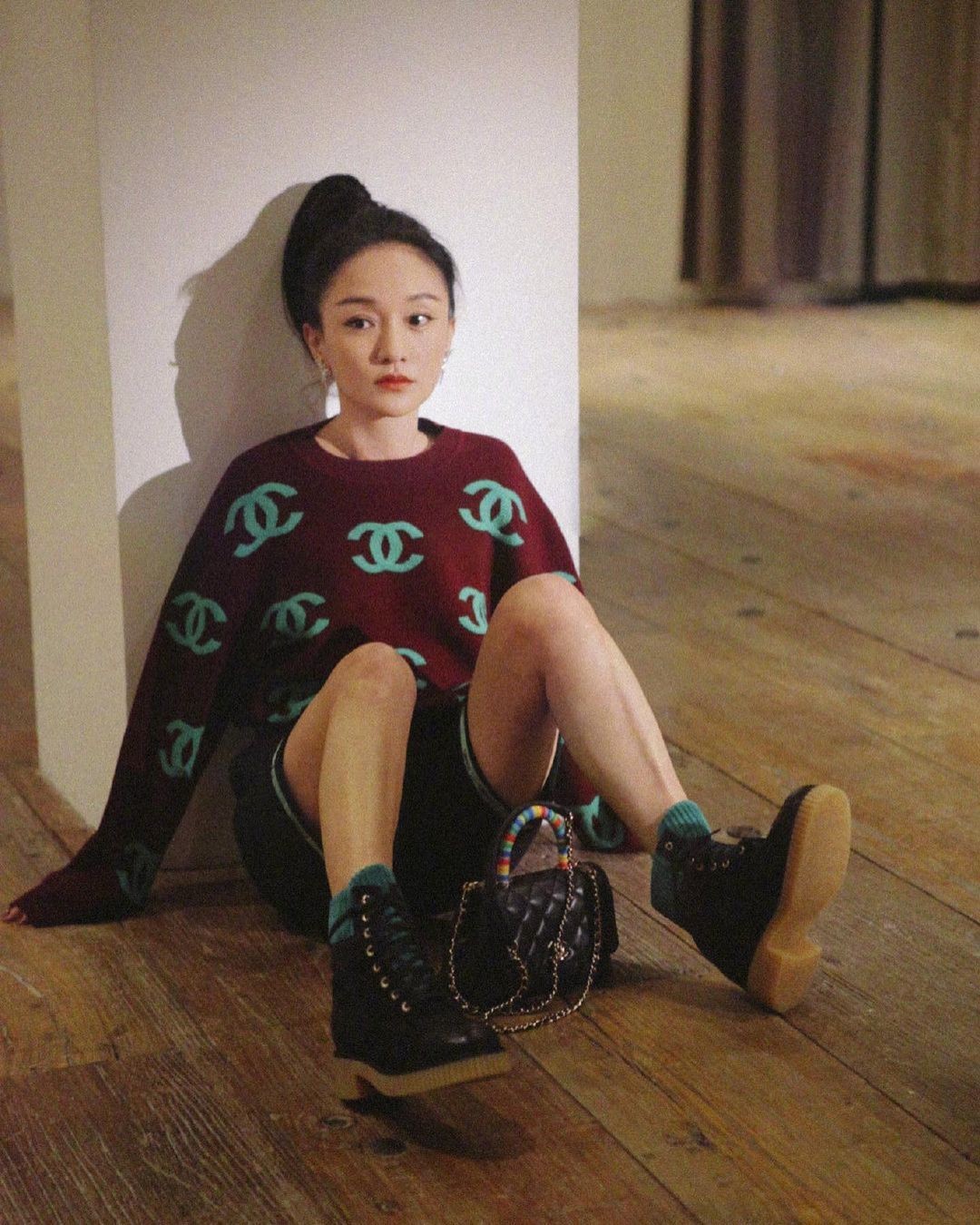 还有女星周迅以CHANEL 2021春夏预告系列的针织衫亮相,只见周迅绑起高马尾颜值逆龄许多,并且随意拎包席地而坐摆拍,加上遍布上身的双C印花,酒红与薄荷蓝的撞色搭配令人耳目一新,也成为力压全场的焦点。