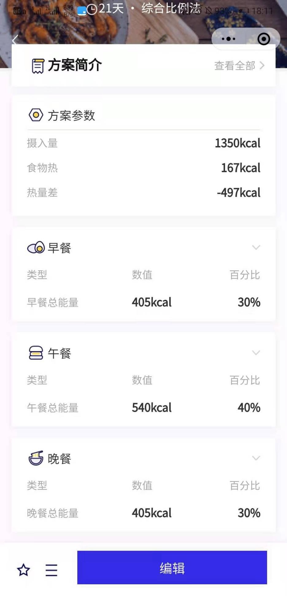 根据减脂需求和身体数据,结合我自己的特殊情况,教练为我制定了每日摄入1350kcal的饮食方案,既保证了每天能够制造497kcal的热量差,同时也能够保证哺乳期期间的营养充足与均衡,这一点是非常重要的。