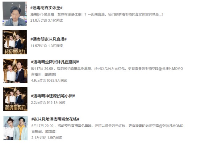 据不完全统计,此次直播喜提多个微博热搜话题,其中#潘粤明真实体重#话题阅读量3亿+,讨论21.1w+,本次直播全部话题阅读量累计6.65亿+,讨论42.4万+。直播之后,潘老师微博怒涨2万+粉,微博直播一姐张沫凡的影响力真是不容小觑。