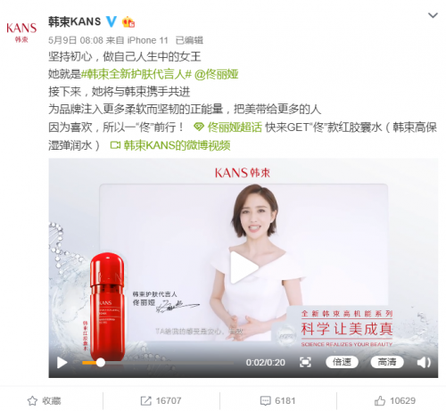 官宣期间,上美集团韩束再次展现出拥抱年轻用户、积极求变的战略方法论,以消费者喜闻乐见的方式,于微信、微博、微淘等社交媒体上与年轻用户频繁互动,全网引爆代言信息。截至5月13日17点,上美集团韩束携佟丽娅的20秒官宣视频播放量已突破235万次,官宣微博转发量近2万次,微博超话#上美集团韩束全新护肤代言人#累计阅读量就已达858.1万,转赞评总数累计2.4万条,传播效果可见一斑。
